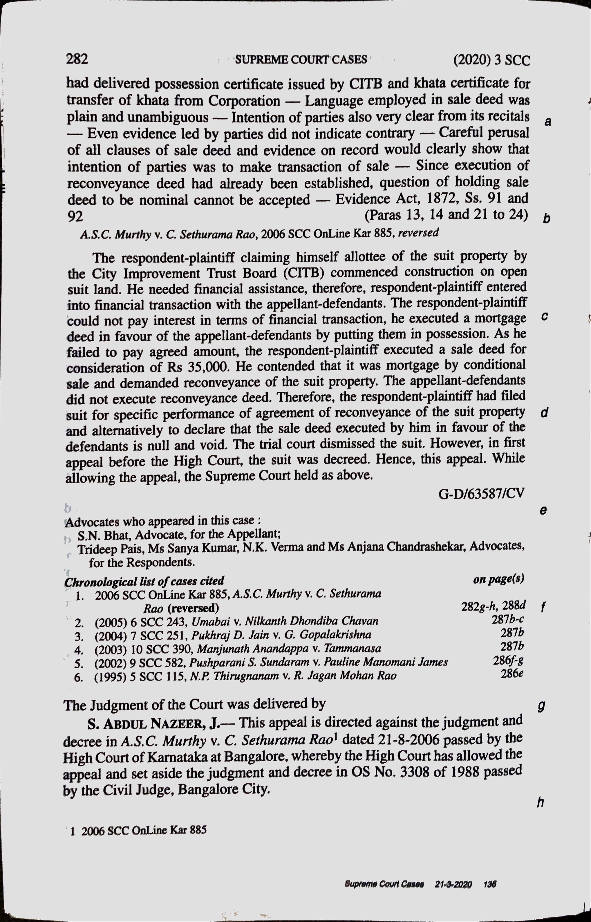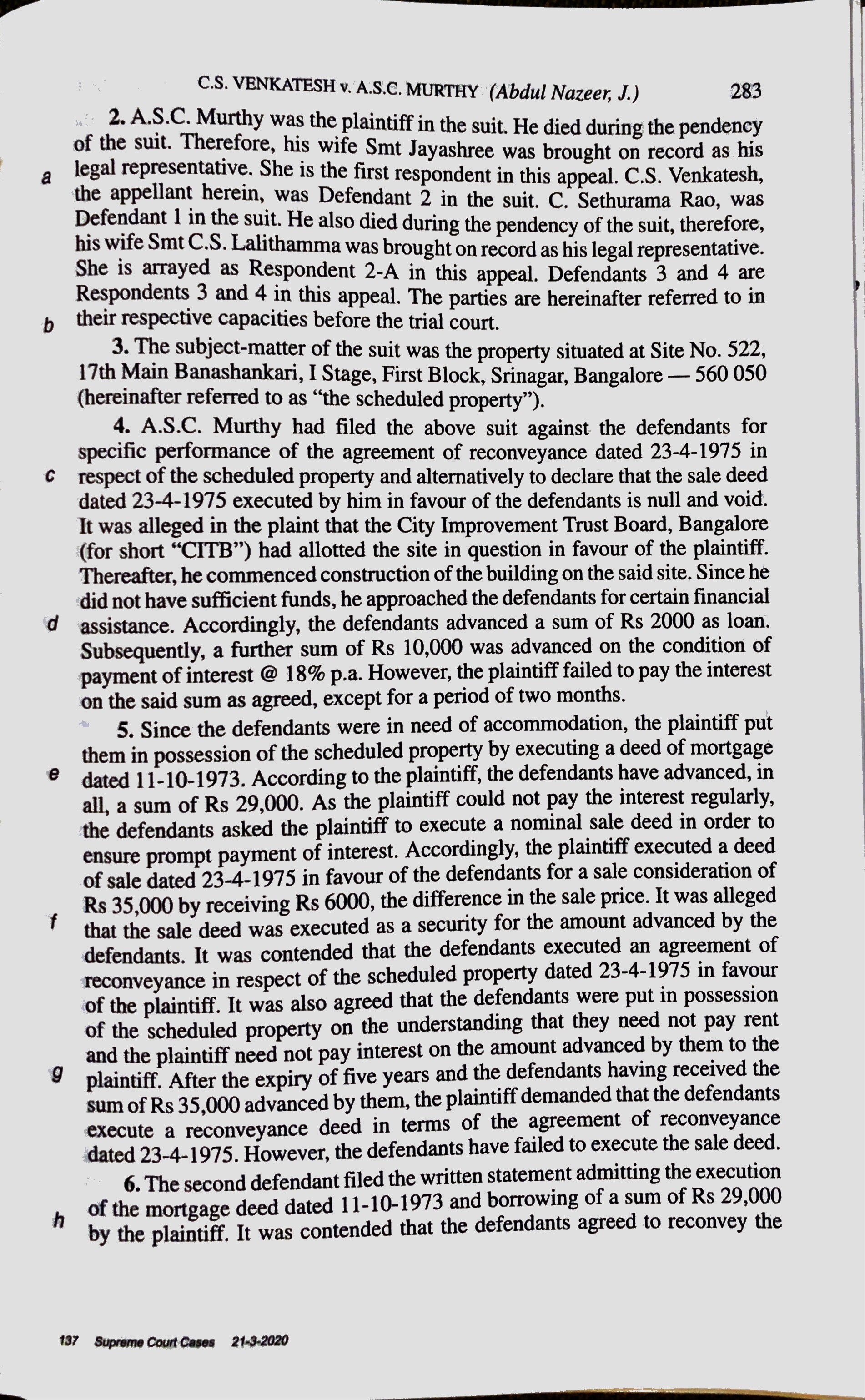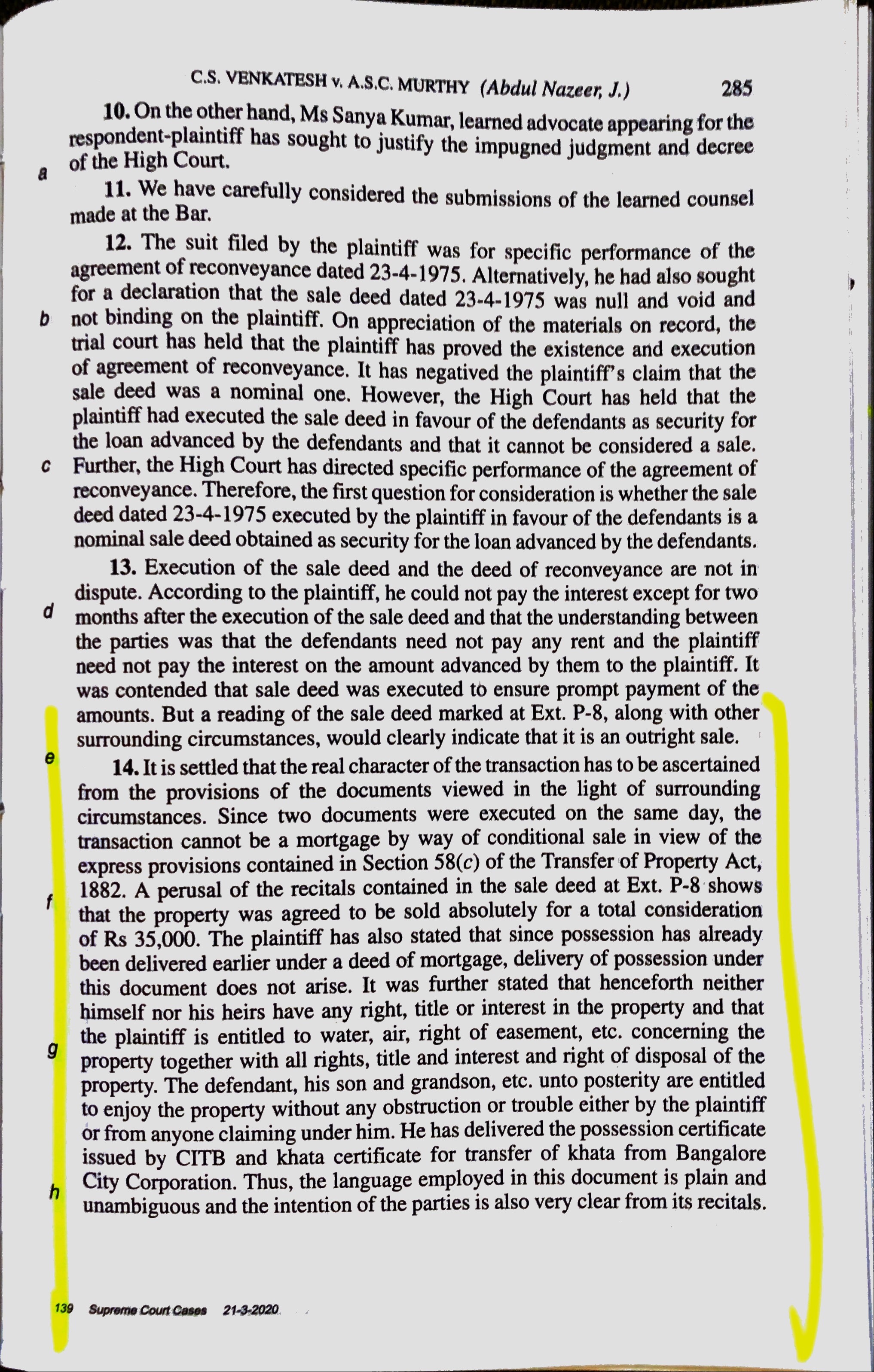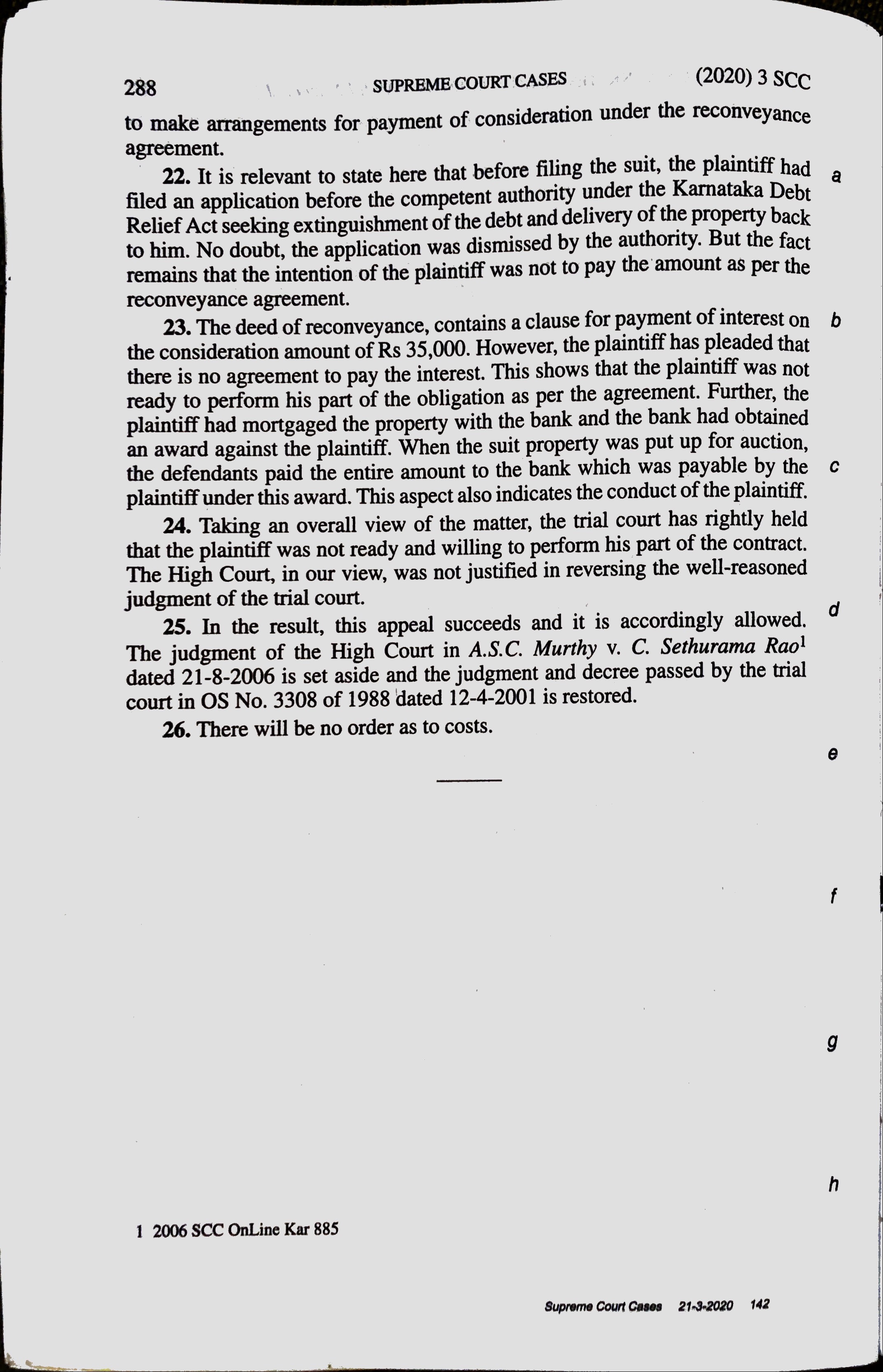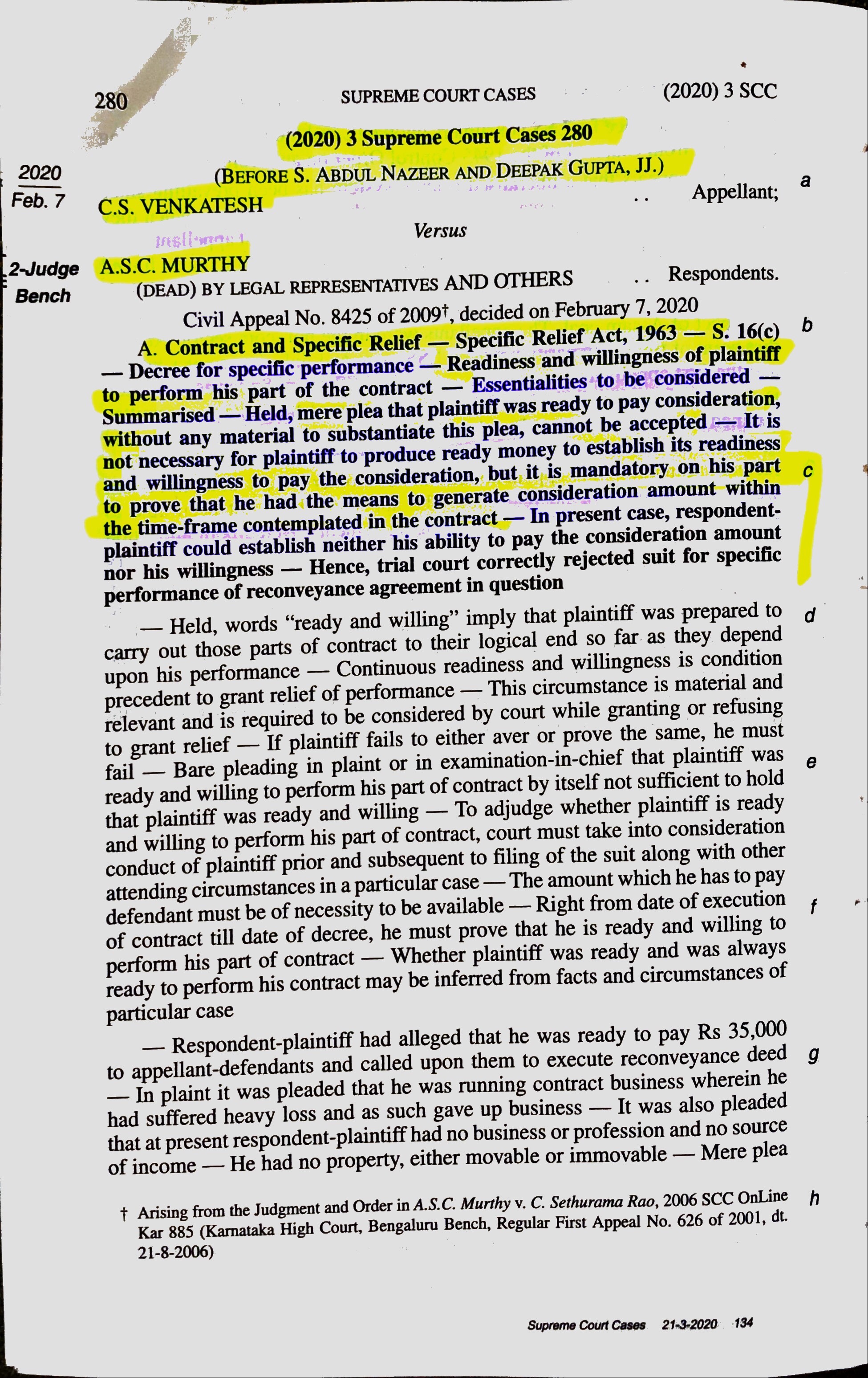 Suit for specific performance. Readiness and willingness. Mere plea that the plaintiff was ready to pay consideration without any material to substantiate cannot be accepted. Though it is not necessary to produce ready money, it is mandatory to prove that he had the means to generate consideration amount within the timeframe contemplated in the contract. Paragraphs 13 to 24. C.S Venkatesh vs A.S.C Murthy