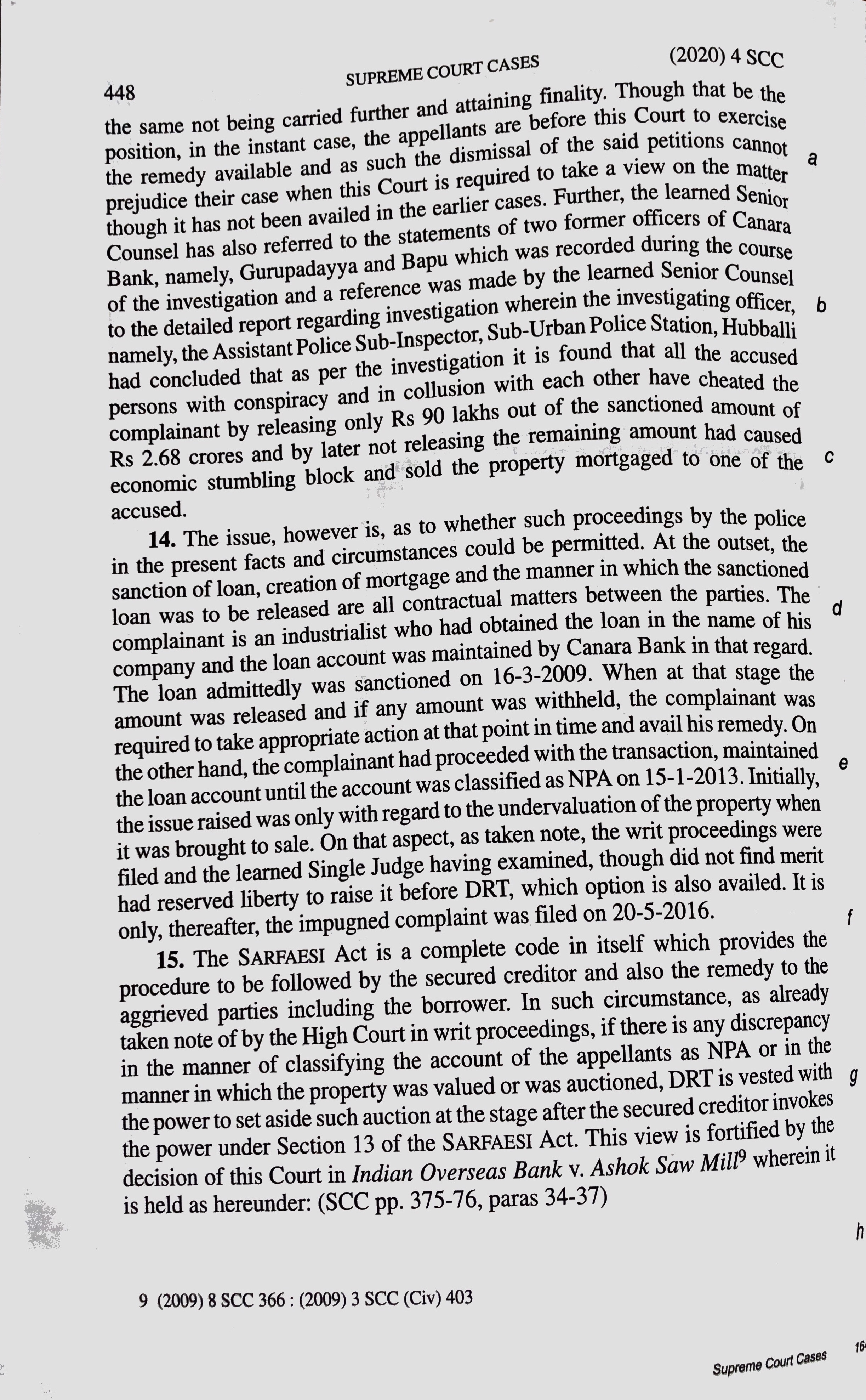 Criminal proceedings against Bank officials. Complaint that the bank officers acted illegally in not fully sanctioning the loan and caused loss to borrower. Alternative remedy available under SARFAESI Act. Criminal proceedings on the allegations which are civil in nature are liable to be quashed.Sanction of loan, creation of mortgage and the manner in which the sanctioned loan was to be released or all contractual matters between the parties. Karnataka High Court judgment reversed.