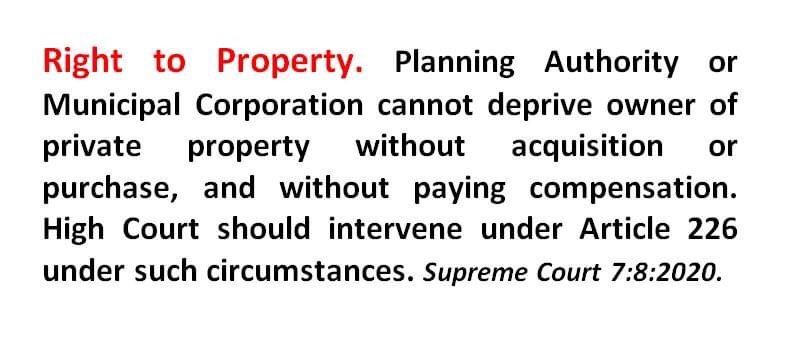 Right to Property. Planning Authority or Municipal Corporation cannot deprive owner of private property without acquisition or purchase, and without paying compensation. High Court should intervene under Article 226 under such circumstances. Supreme Court 7:8:2020.