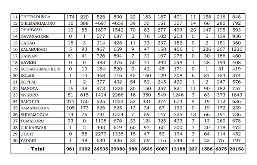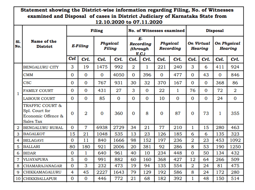 Gearing up to meet the challenges posed by Covid-19 pandemic, the trial courts in Karnataka have successfully adopted technology to examine witnesses and dispose cases, both civil and criminal. The “Statement showing the District-wise information regarding Filing, No. of Witnesses examined and Disposal of cases in District Judiciary of Karnataka State from 12:10:2020 to 07:11:2020″” published on the official website of the Karnataka High Court gives district-wise information about Filing (both e-filing and physical), E-Recording and Physical Recording of witnesses, Virtual Hearing and Physical Hearing of cases. The information in tabular form is reproduced below.