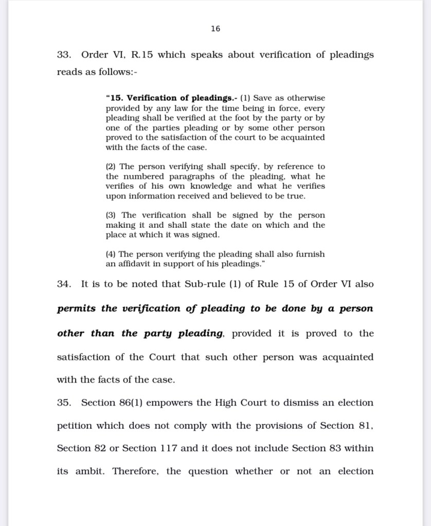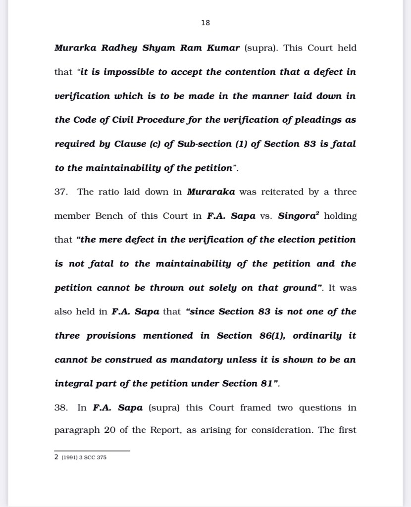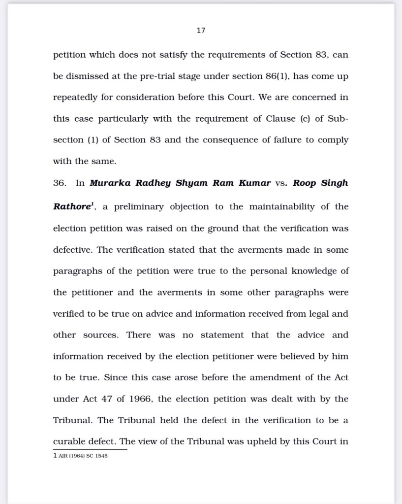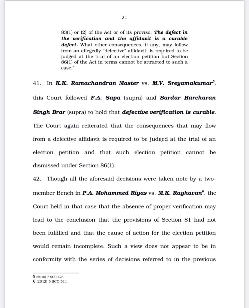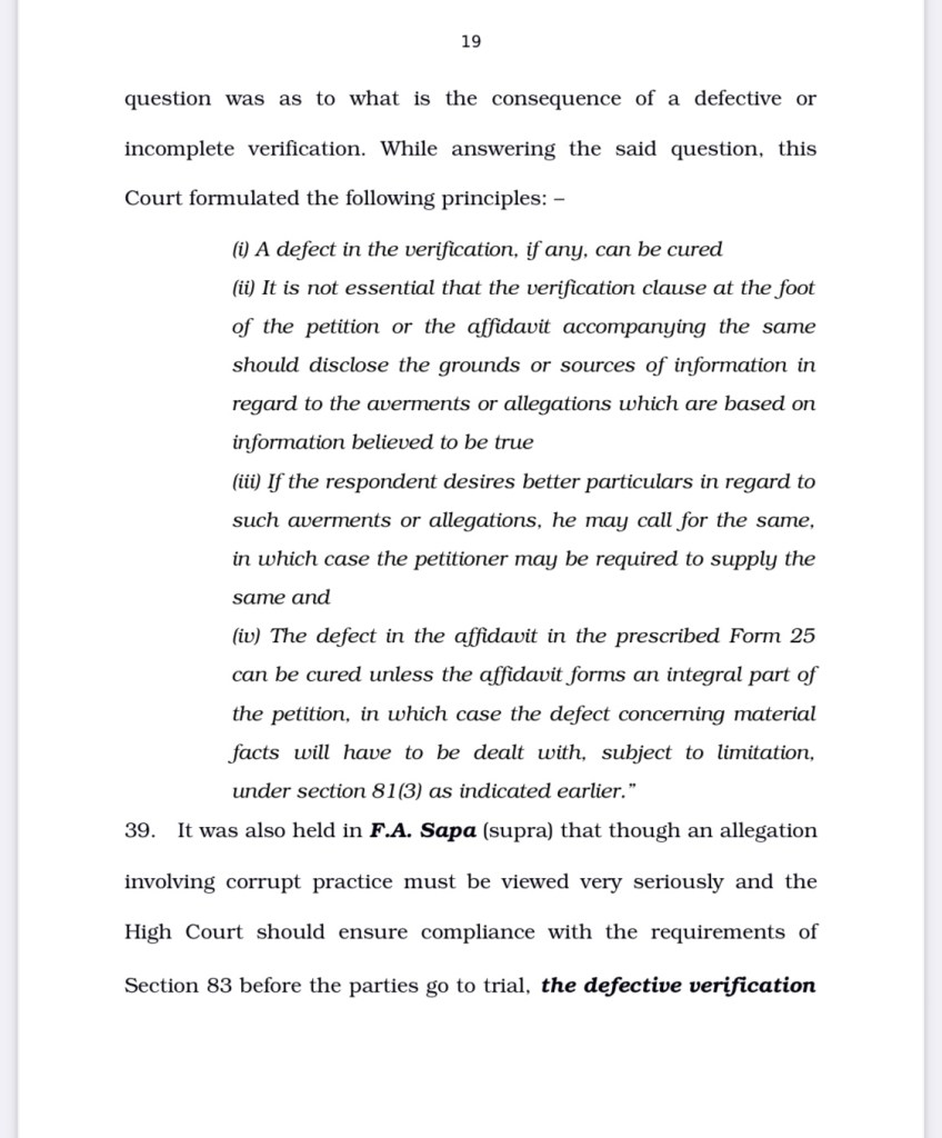 Relevant para: 43. The upshot of the above discussion is that defective verification is a curable defect. An election petition cannot be thrown out in limine, on the ground that the verification is defective.