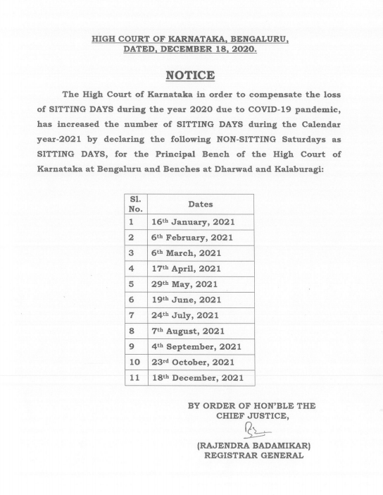 The Notice dated 18 December 2020 issued by the Karnataka High Court shows increase in working days in 2021. The High Court will function on 11 Saturdays. However summer holidays remain intact.