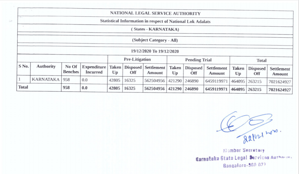 In perhaps one of the biggest Lok Adalats, the E Lok Adalat held by the Karnataka State Legal Services Authority on 19 December 2020 disposed 16325 pre-litigation and 2,46,890 pending cases. The total settlement amount in pre-litigation cases is Rs. 56,25,04,956/- and in pending cases Rs. 645,91,19,971/- totaling Rs.702,16,24,927/-.