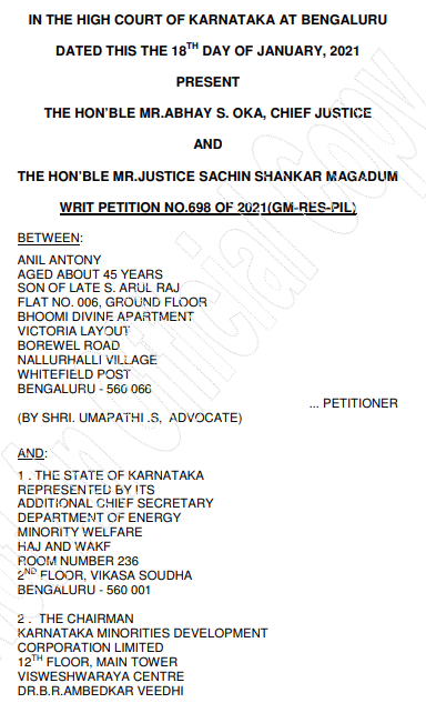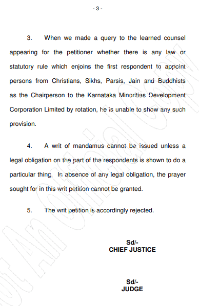 Writ seeking appointment of members from religious minorities as Chairman of Minorities Development Corporation by rotation. In the absence of a legal obligation, such a direction cannot be issued. Karnataka High Court. Posted byrajdakshalegal January 23, 2021 Leave a comment on Writ seeking appointment of members from religious minorities as Chairman of Minorities Development Corporation by rotation. In the absence of a legal obligation, such a direction cannot be issued. Karnataka High Court. Read judgment: Share this: Click to share on X (Opens in new window) X Click to share on Facebook (Opens in new window) Facebook Like Loading... Published by rajdakshalegal Senior Advocate, High Court of Karnataka, Bengaluru View more posts