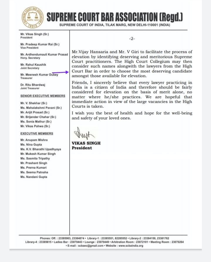 The letter of the Supreme Court Bar Association dated 8:6:2021, which seeks elevation of lawyers practicing before the Supreme Court to High Courts, uses the following words;