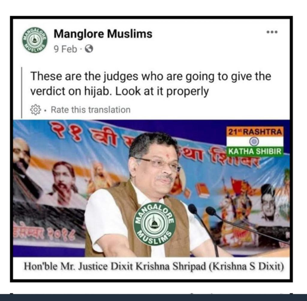 Many disturbing posts and messages are circulated by a group called “Mangalore Muslims” making false, motivated and highly derogatory comments on Justice Krishna Dixit. See below;