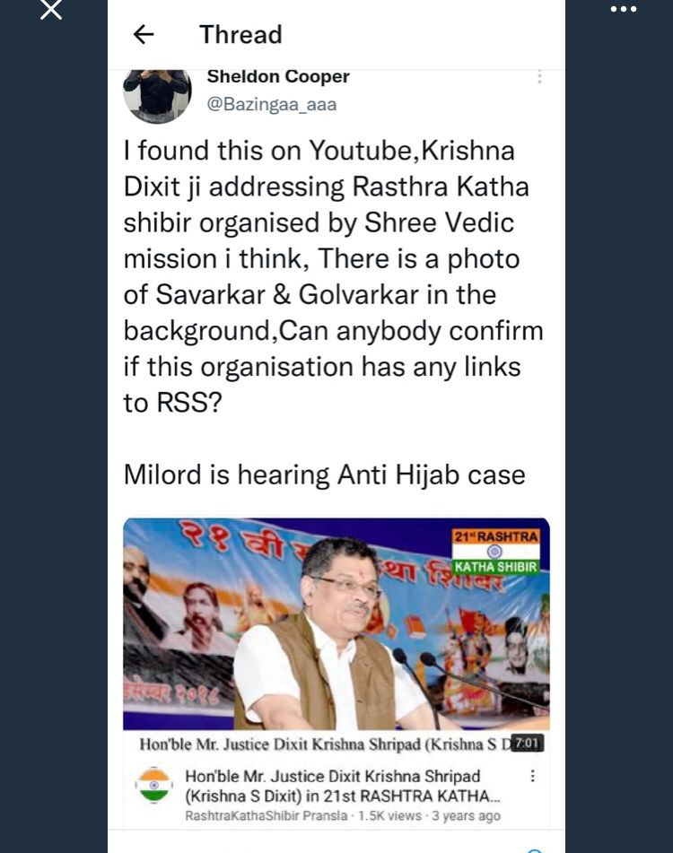 The comments insinuate Justice Krishna Dixit participating in a function having RSS links. These comments are made by few fanatics without even knowing what is “Rashtra Katha Shibir”. I personally verified from the organisers and their website and the reality is far from what is projected by the fanatics.