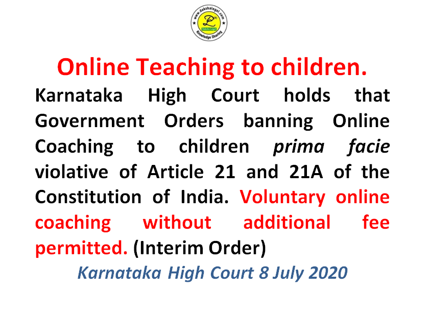 Karnataka High Court holds that Government Orders banning Online Coaching to children prima facie violative of Article 21 and 21A of the Constitution of India. Voluntary online coaching without additional fee permitted. (Interim Order)